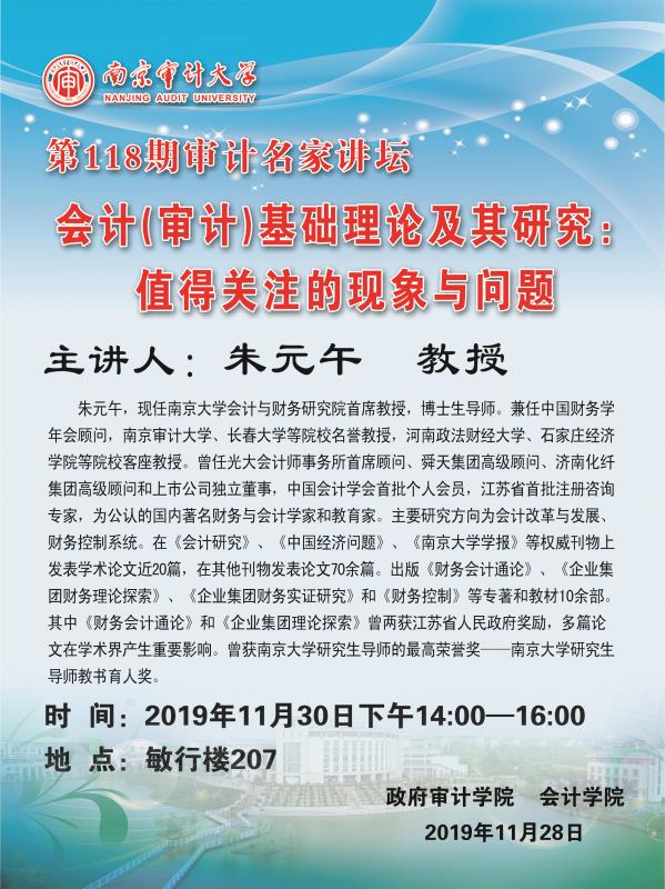 第118期审计名家讲坛,会计(审计)基础理论及其研究:记得关注的现象与问题。主讲人:朱元午教授。