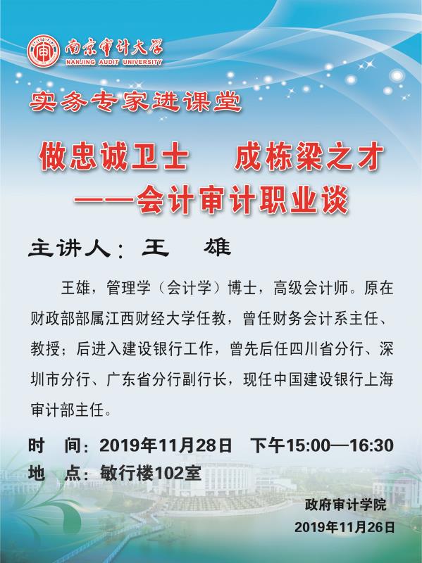 【讲座通知】主讲人:王雄教授 题目《做忠诚卫士 成栋梁之才——会计审计职业谈》