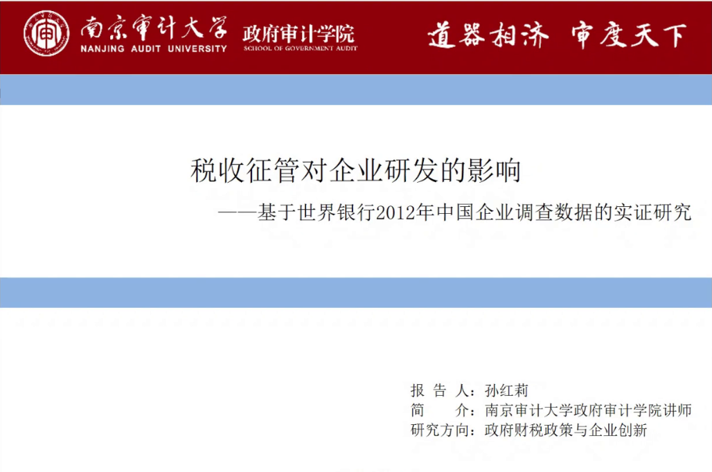 首先,孙老师做了题为“税收征管对企业研发的影响——基于世界银行2012年中国企业调查数据的实证研究”的主题报告,报告主要分为四部分阐述:
