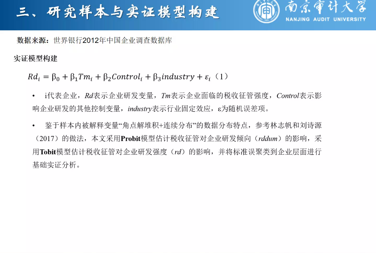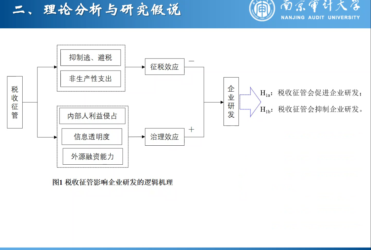 第二部分为理论分析与研究假说,孙老师指出:一方面,税收征管会抑制企业逃、避税行为,增加企业非生产性支出,从而降低企业内源融资能力,通过“征税效应”抑制企业研发。另一方面,税收征管有助于遏制内部人利益侵占行为,提高企业信息透明度以及提升企业外源融资能力,通过“治理效应”促进企业研发。