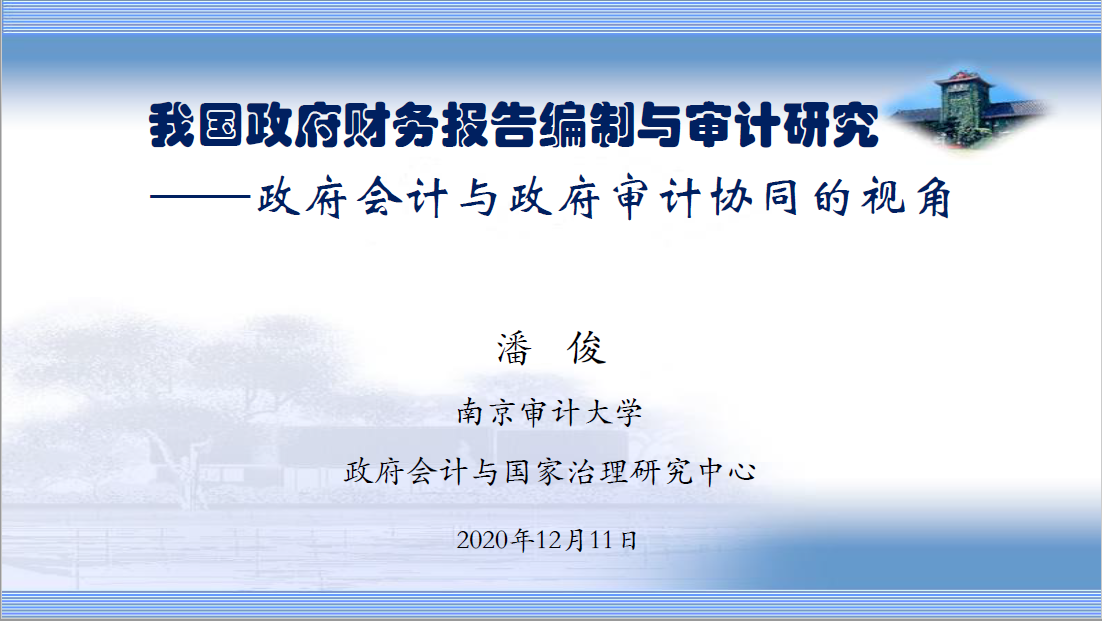 首先,潘老师做了题为“我国政府财务报告编制与审计研究——政府会计与审协同的视角”的主题报告,报告主要分为两部分阐述: