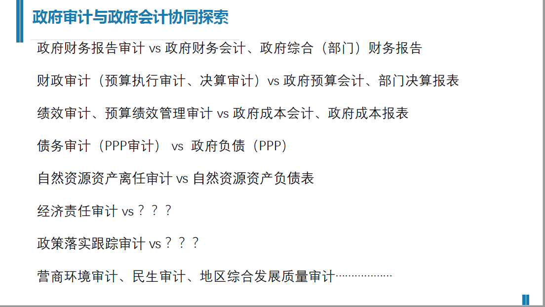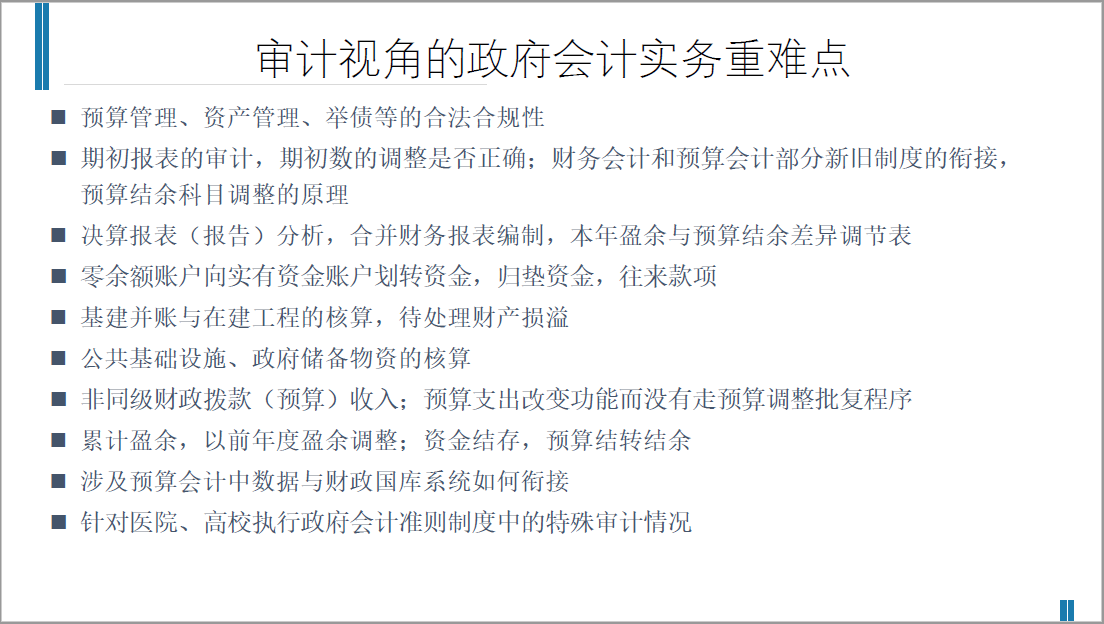 随后,潘老师结合最新发布的《政府财务报告审计办法(试行)》,介绍了审计机关开展政府采取报告审计工作的具体规定,并从审计视角指出了政府会计实务重难点。