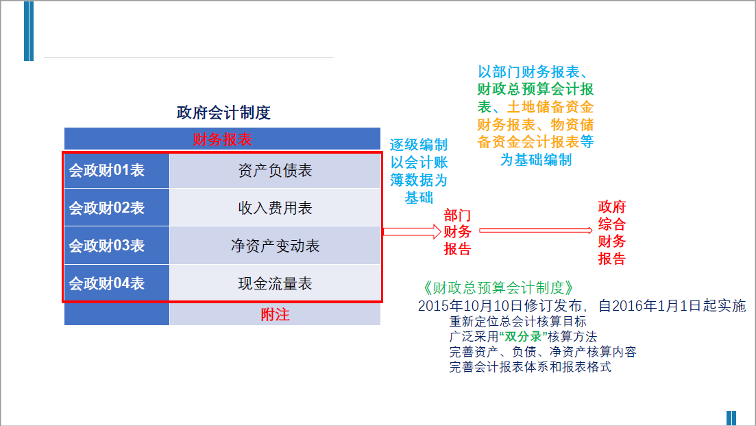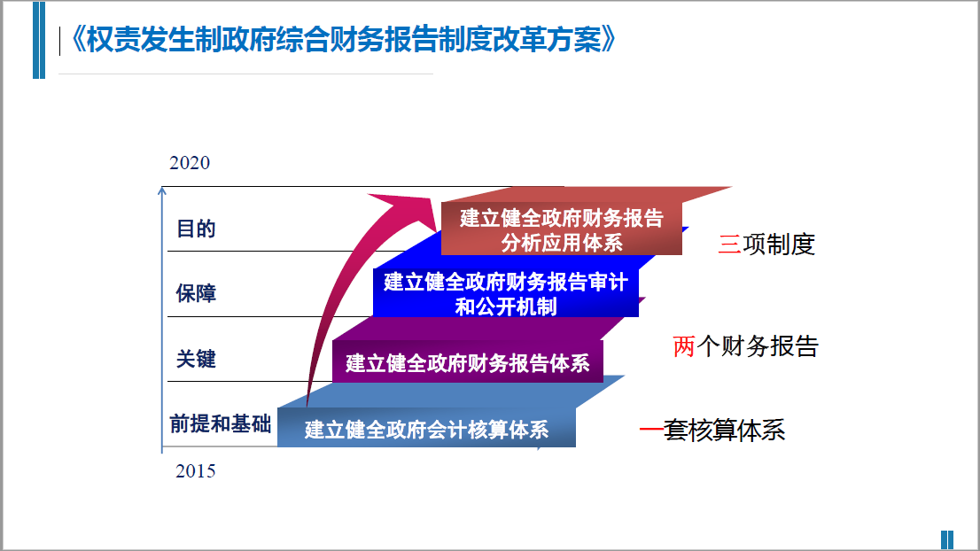 潘老师还指出政府会计改革四大任务包括建立健全政府会计核算体系、政府财务报告体系、政府财务报告审计和公开机制以及政府财务报告分析应用体系,前三大任务相关的制度有望于今年年底出台,最后一项任务仍在不断探索中。报告中还具体阐述政府财务报告编制规章制度、试点进程以及报表编制程序,并对部门决算报告与财务报告进行了比较。