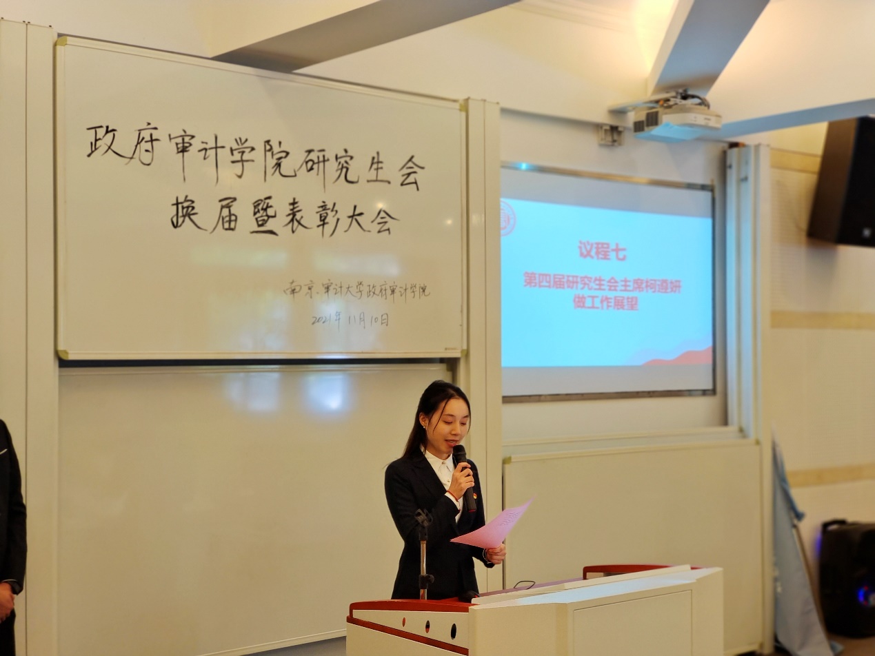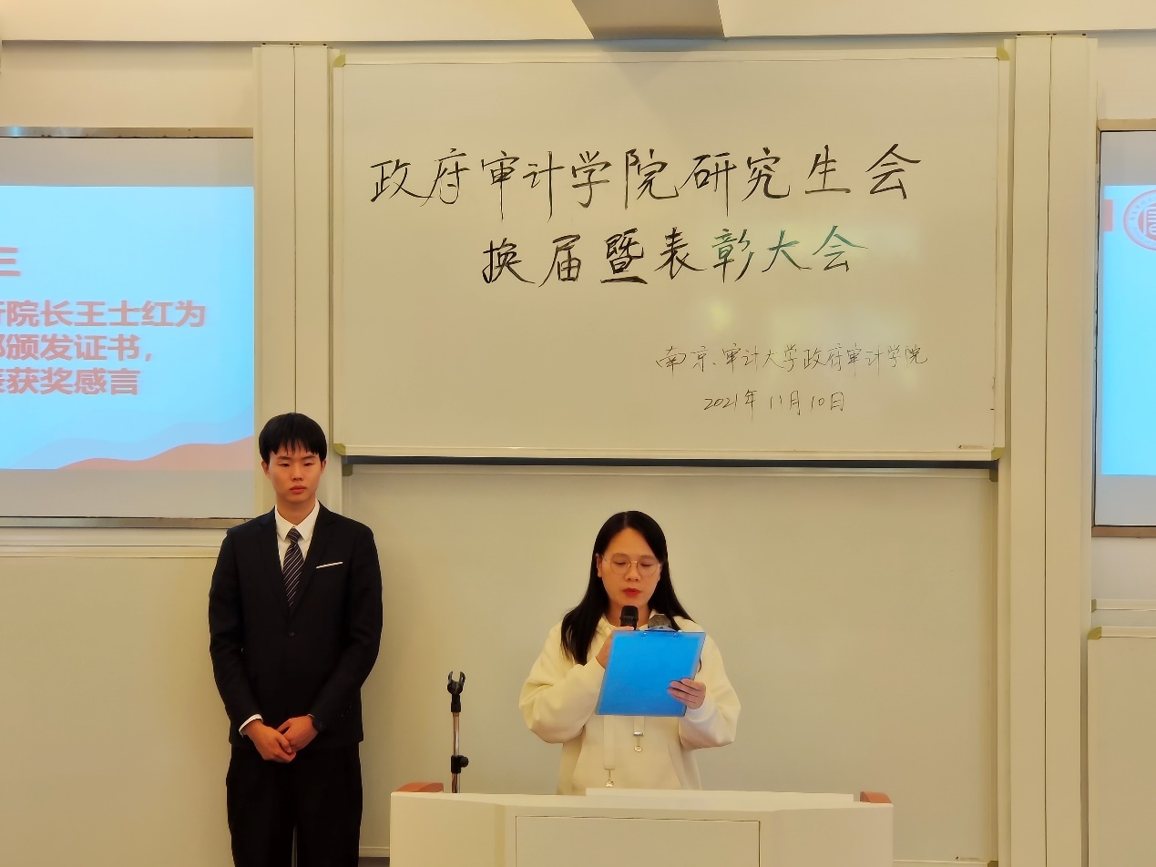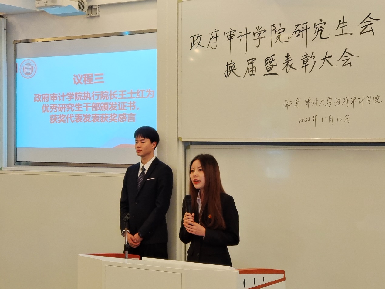执行经理王士红为优秀研究生干部颁发证书,获奖代表娄可凡发表获奖感言。
