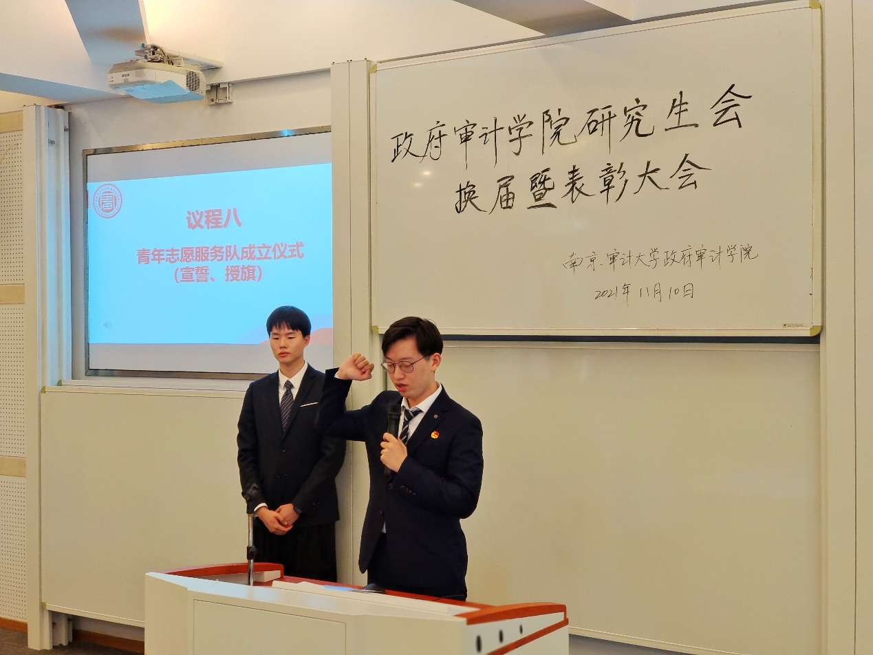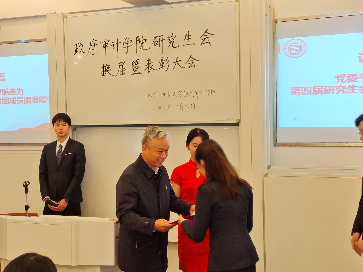 党委书记童瑞连为第四届研究生会主席团成员颁发聘书。