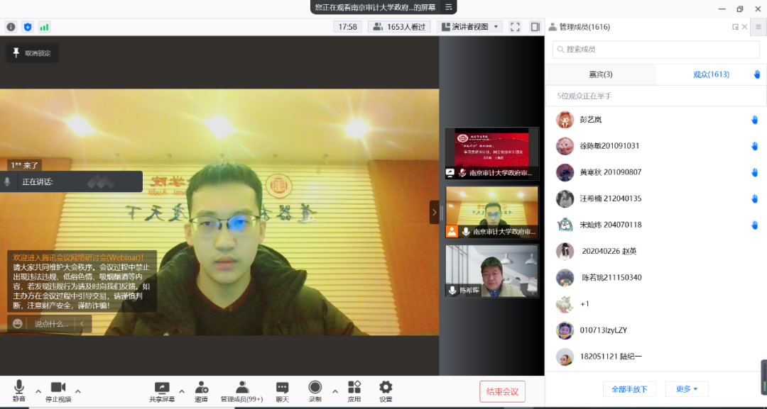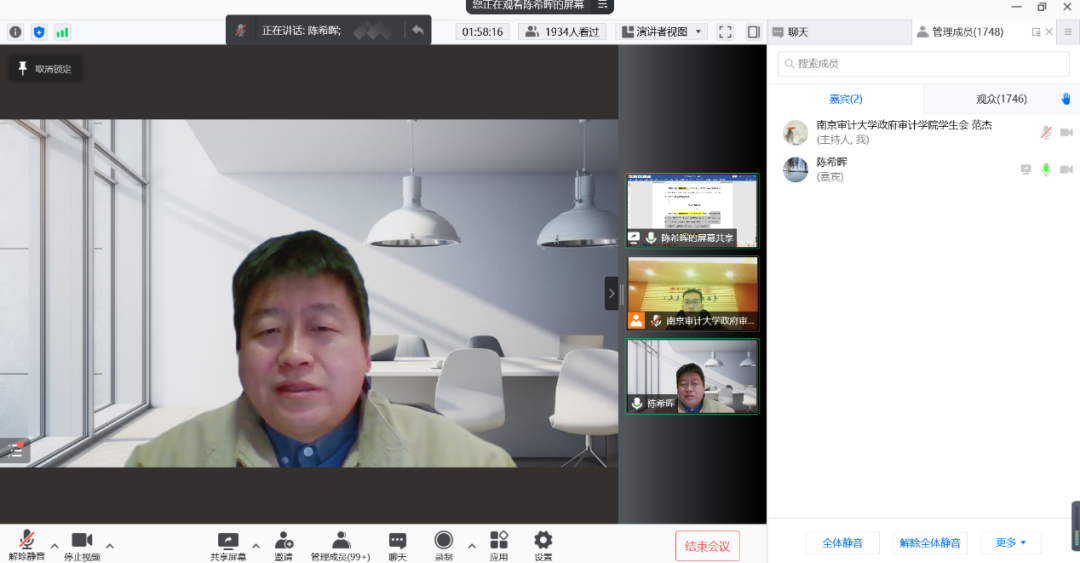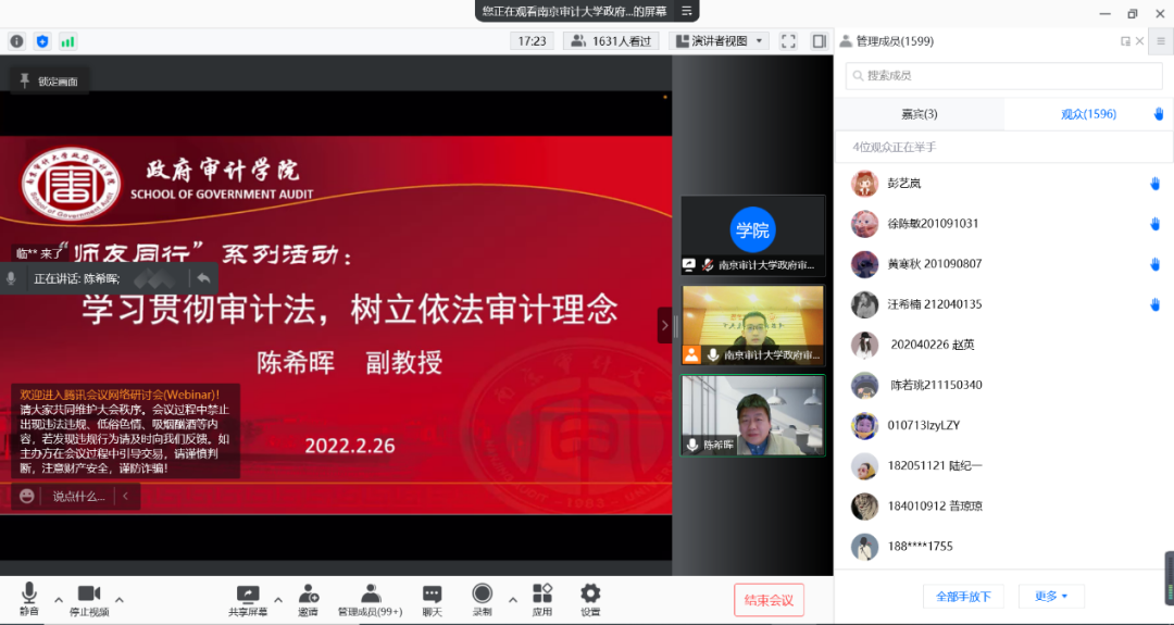 2月26日晚,必一运动必一运动邀请陈希晖副教授通过线上方式参与“师友同行”系列活动,以“学习贯彻审计法,树立依法审计理念”为主题,分享对新修订审计法的解读。讲座持续了两个小时,来自西南财经大学、中南财经政法大学、上海立信会计金融公司、浙江财经大学、浙江工商大学、湘潭大学等校本科生和研究生也都参与其中,累计1934人参加讲座,实时点赞18.6万,产生了良好的效果,也为“师友同行——共话审计法”征稿活动充分预热。