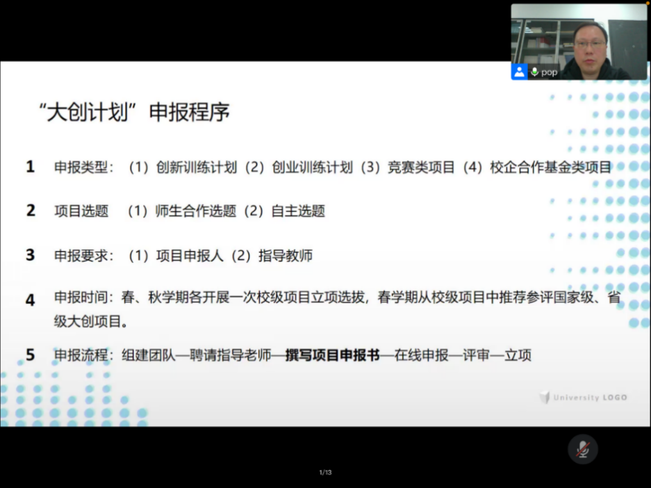 讲座围绕老员工创新创业训练计划的内涵和意义、大创项目申报程序和遴选规则、如何撰写高质量大创项目申报书三大部分展开。