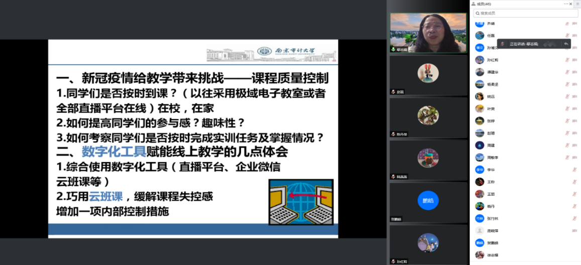 为响应公司“教师网络教学能力培训和线上教学经验分享月活动”,帮助教师熟悉更多线上教学工具、提高信息化教学水平,4月7日晚,必一运动通过线上会议方式举行了一场线上教学培训交流会。本次培训交流会由李兆东副经理主持,审计系鄢志娟、顾正娣、李华、楚有为等四位教师分别做分享发言,全院教师参加线上交流。