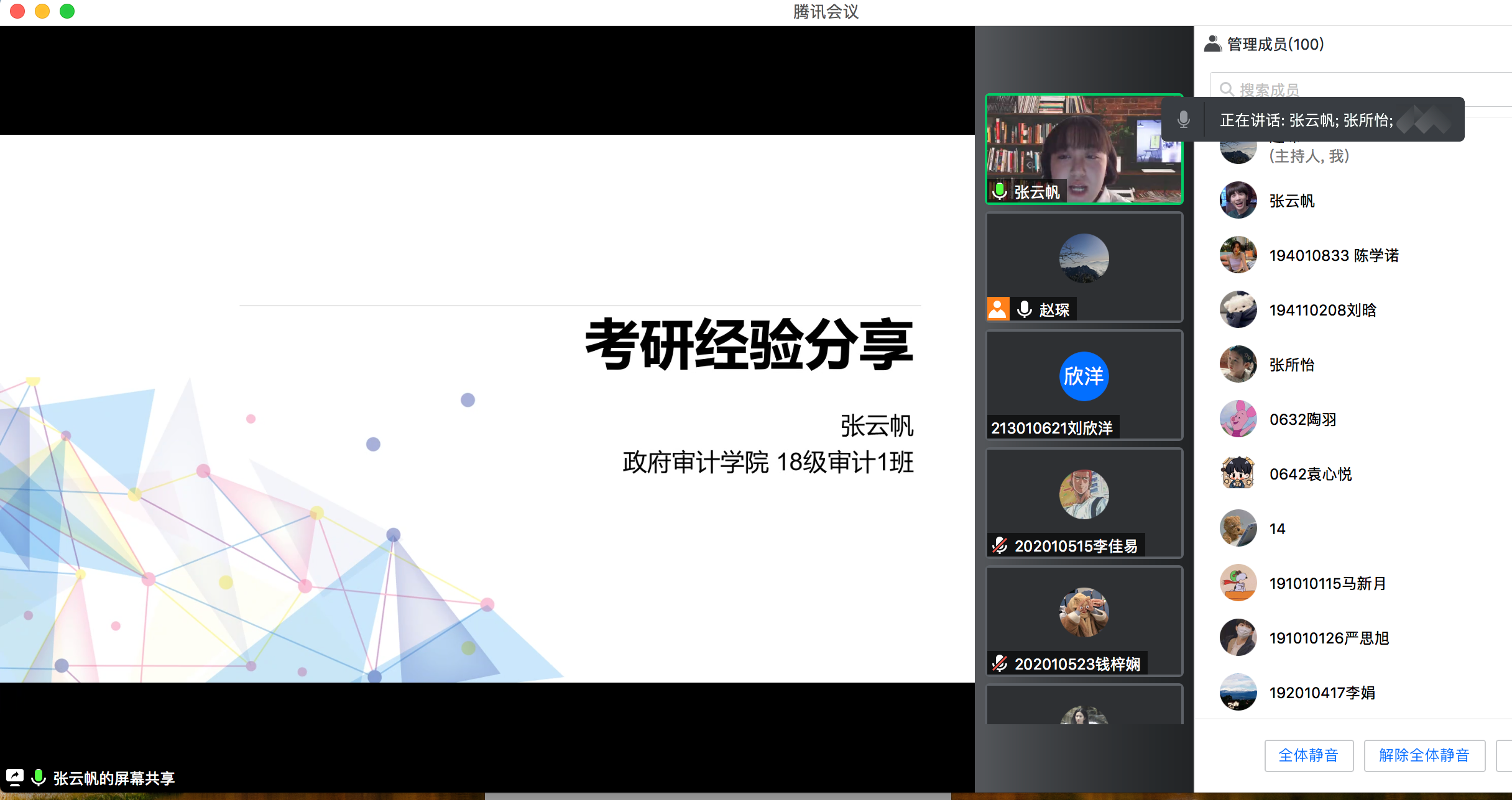 为使必一运动学子们对考研有更深入了解,帮助同学们树立正确奋斗目标,有效提升竞争力。4月20日下午,公司20级审计5班、20级审计7班、21级审计6班联合线上举办“考研经验交流分享会”活动,活动邀请公司考取西南财经大学审计专硕的张云帆、必一运动审计专硕的单炳霖、上海财经大学金融专硕的杨宇曦、对外经济贸易大学金融专硕的方珊珊四位同学分享交流。会议也吸引了其他年级共100余名同学参与。活动由21级审计6班专业班主任赵琛老师主持。