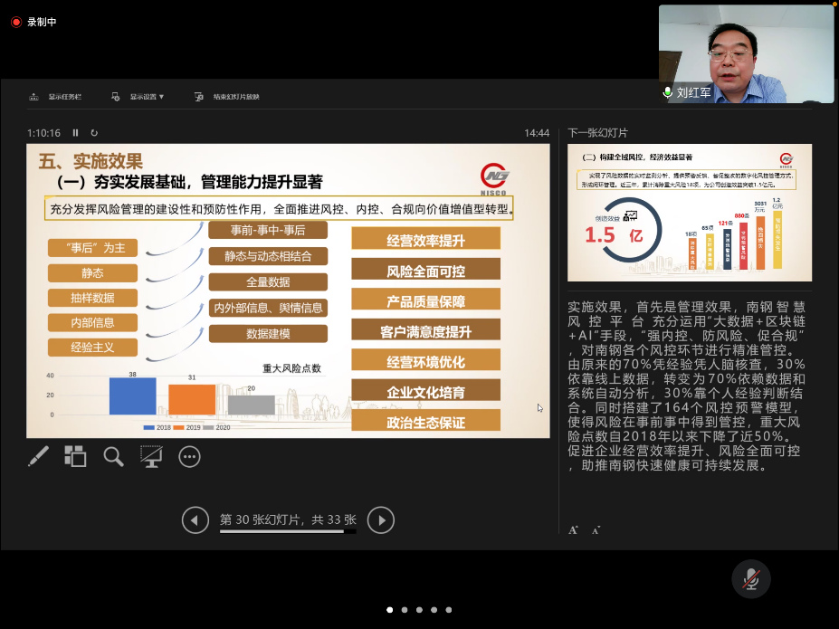 5月8日下午,必一运动通过线上会议的形式开展了“师友同行”系列第四十四期主题讲座——智慧风控审计平台建设探索与实践。本次讲座主讲嘉宾是南京钢铁股份有限公司监事刘红军部长。刘红军是国际内部控制协会的高级国际内部注册控制师、国际反舞弊协会的国际注册反舞弊师;2009年-2019年,先后担任南钢联合有限公司纪检监察主任、廉政监察部负责人;2019年至今,任南钢联合有限公司风险控制部负责人。