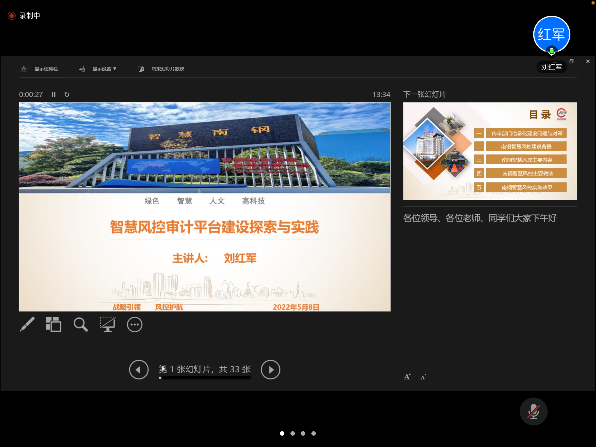 本次讲座刘部长围绕南钢内审部门信息化建设问题与对策、南钢智慧风控建设背景、主要内容、主要做法及实施效果五个部分展开。