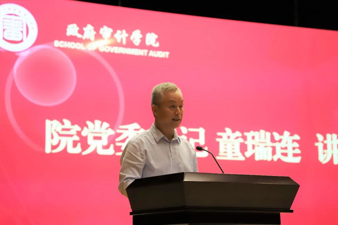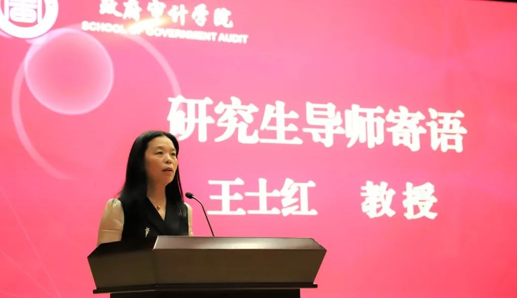 2022级审计专硕赵莉欣同学代表研究生新生发言。她讲述了跨专业考研的心路历程,回顾了考研时的孤独与艰辛,无数次的挑灯夜读换来了今日的硕果累累。作为一名新审计人,她对今后的校园生活做出规划,并以院训“道器相济,审度天下”与大家共勉。