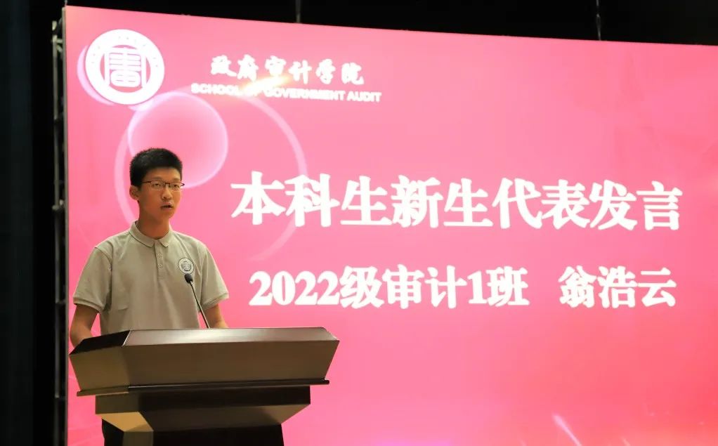 2022级审计1班翁浩云同学代表本科生新生发言。他回首军训的美好时光,总结了军训于员工生活与学习的意义,并以“凡所过往,皆为序章”激励同学们忘却过去或失意或欢乐的日子,共同展望在南审的崭新未来。