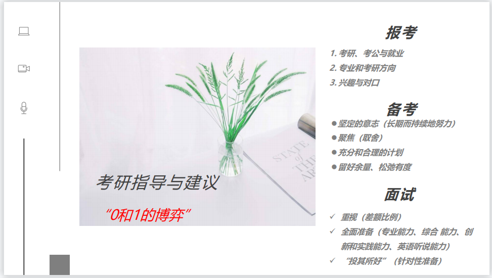其中针对考研问题,周老师尤为重视,从报考、备考、面试三个阶段逐一进行详细指导,指出考研是“0”和“1”之间的博弈,解决了同学们当前的困惑。同学们听后表示豁然开朗,对考研有了更为深入的认知。